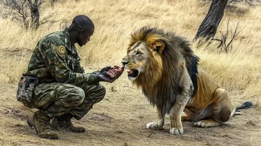 הוא הוציא חתיכת בשר והניח אותה בזהירות מול החיה.