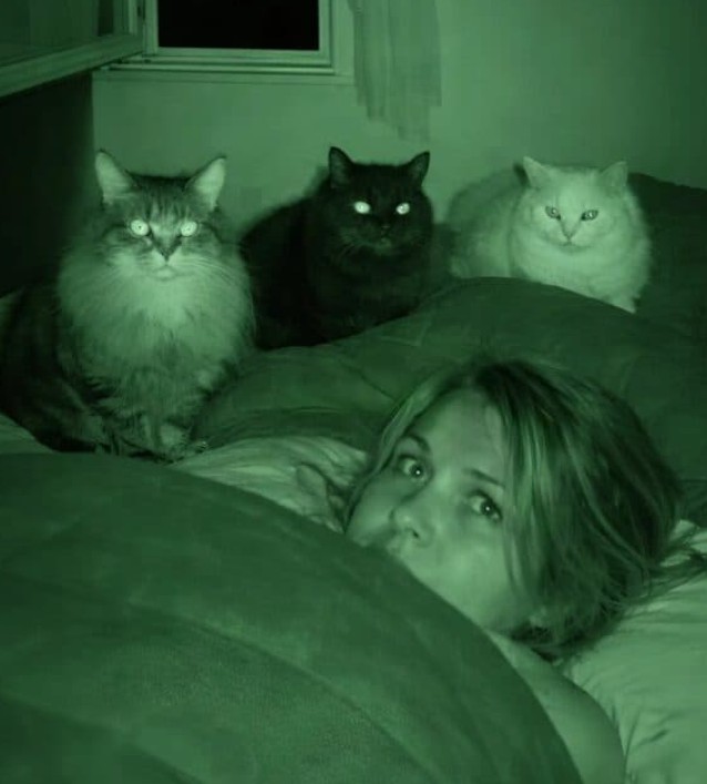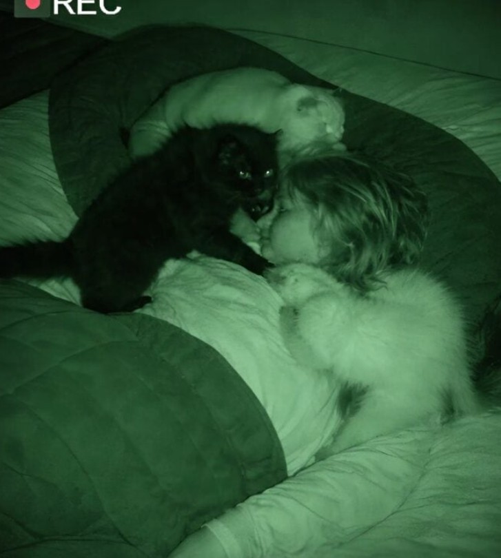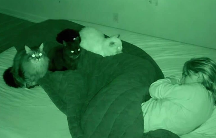 Bu gizemi çözmek için yatak odasına gece görüşlü bir kamera yerleştirmeye karar verdim. Sabah kaydı izlediğimde ilk başta her şey normal görünüyordu: Kediler odaya giriyor ve başucumda nöbet tutar gibi bekliyorlardı. Ancak görüntüyü dikkatle incelediğimde, saat gece üç civarında her şeyin değiştiğini fark ettim. Kediler aniden üzerime atlıyor, göğsümü patiliyor ve beni sarsmaya başlıyorlardı. Birkaç dakika süren bu panik halinden sonra ise sanki hiçbir şey olmamış gibi odadan çıkıp gidiyorlardı.