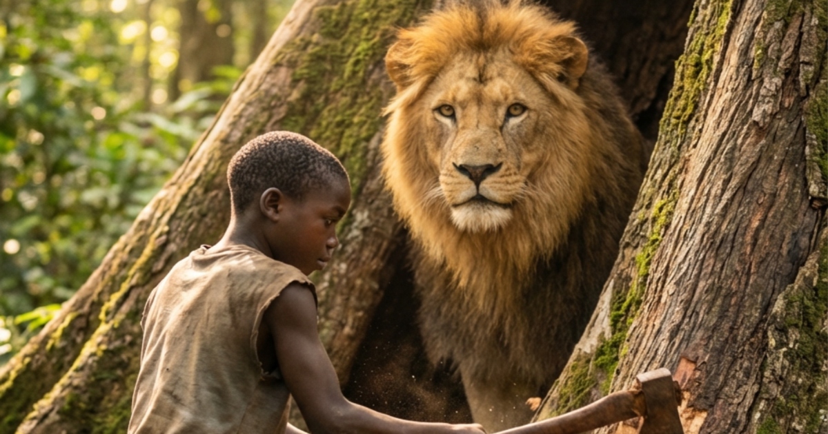 Dakikalar süren mücadelenin ardından ağaç gövdesi büyük bir gürültüyle çatladı ve aslan nihayet özgür kaldı. Çocuk, pençelerin hedefi olacağını düşünerek gözlerini sıkıca kapattı ve olduğu yerde donup kaldı. Ancak beklediği saldırı gelmedi; aksine, yüzünde sıcak ve pürüzlü bir dokunuş hissetti. Dev aslan, sanki teşekkür ediyormuş gibi çocuğun yanağını nazikçe yaladıktan sonra sessizce ormanın derinliklerinde gözden kayboldu.