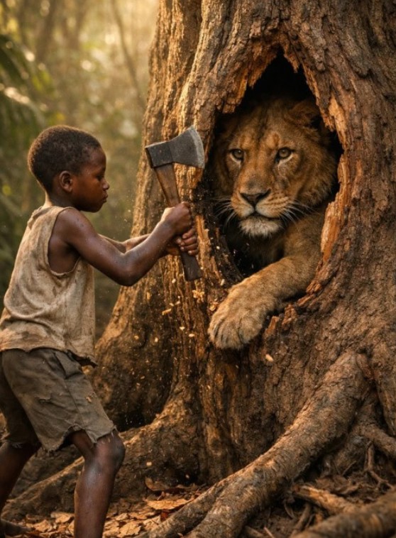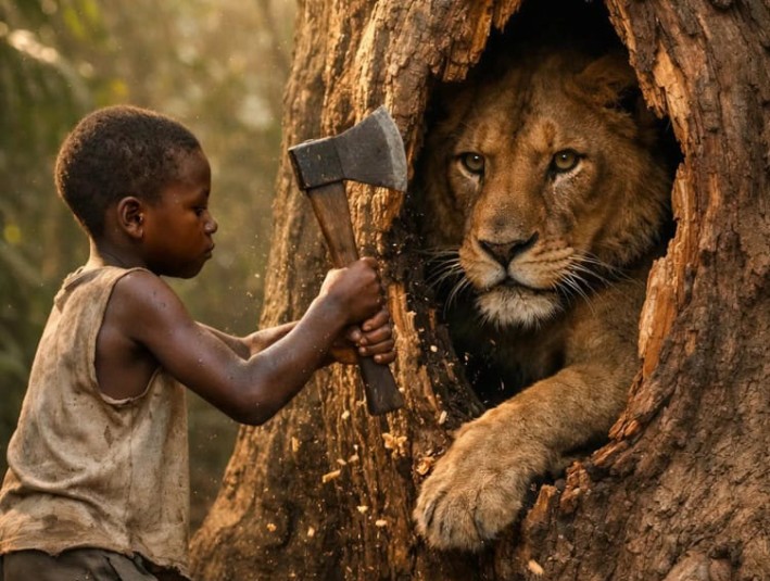 Eve koşup kimseyi bulamayınca, duvarda asılı duran baltayı kaptığı gibi ormana geri döndü. Aslan, kendisine yaklaşan çocuğu görünce savunma içgüdüsüyle kükredi ve dişlerini gösterdi; ancak çocuk geri adım atmadı. Titreyen elleriyle baltayı kavradı ve hayvanın sıkıştığı odun parçasını genişletmek için var gücüyle ağaca vurmaya başladı. Her darbede aslan daha çok hırçınlaşıyor, çocuk ise ter içinde kalarak pes etmeden çalışmaya devam ediyordu.