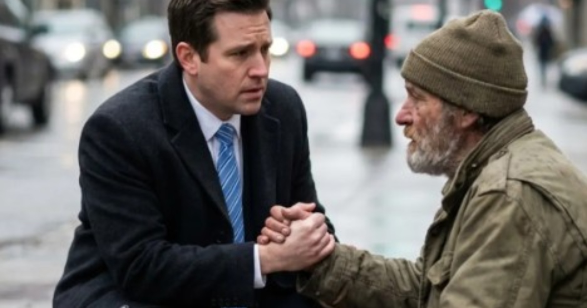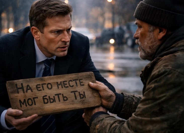 Zengin iş adamı için ofis çıkışında köşedeki evsiz adama bozuk para vermek sıradan bir alışkanlık haline gelmişti. Her akşam durmadan, yüzüne bile bakmadan parasını bırakıp lüks hayatına dönerdi. Ancak sağanak yağmurlu bir akşam, sırılsıklam olmuş yaşlı adam beklenmedik bir şekilde iş adamının kolunu tuttu. “Bana aylarca yardım ettin, şimdi sıra bende,” diyerek ona üzerinde düzensiz harflerle “Onun yerinde sen olabilirdin” yazan kaba bir tahta parçası uzattı. Yaşlı adam, bu tahtayı mutlaka yatağının başucuna asması gerektiğini, hayatının buna bağlı olduğunu fısıldadı.